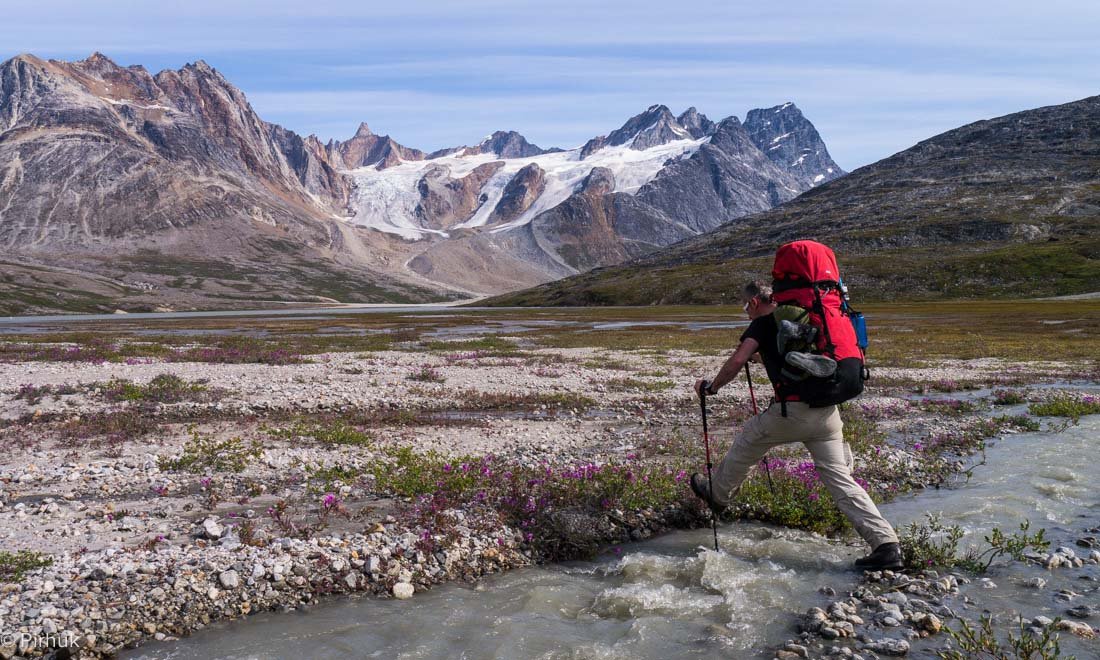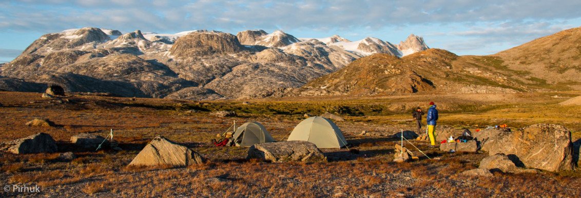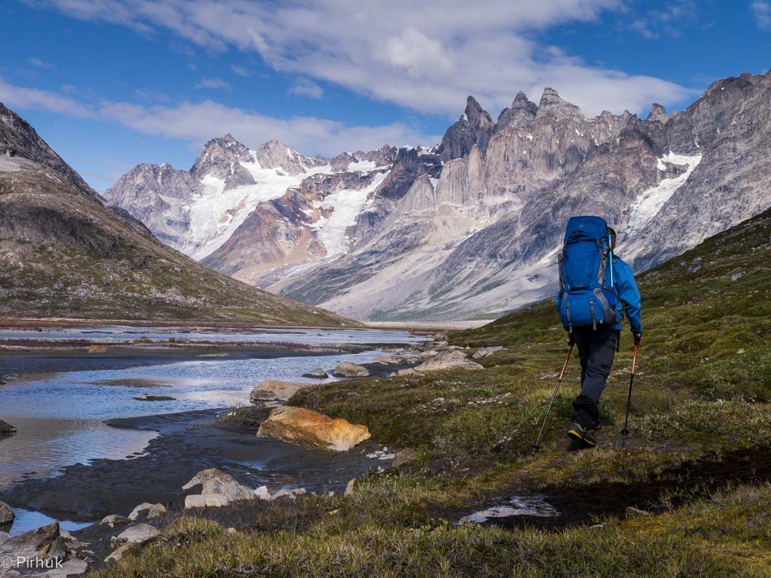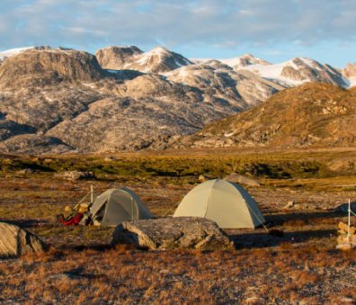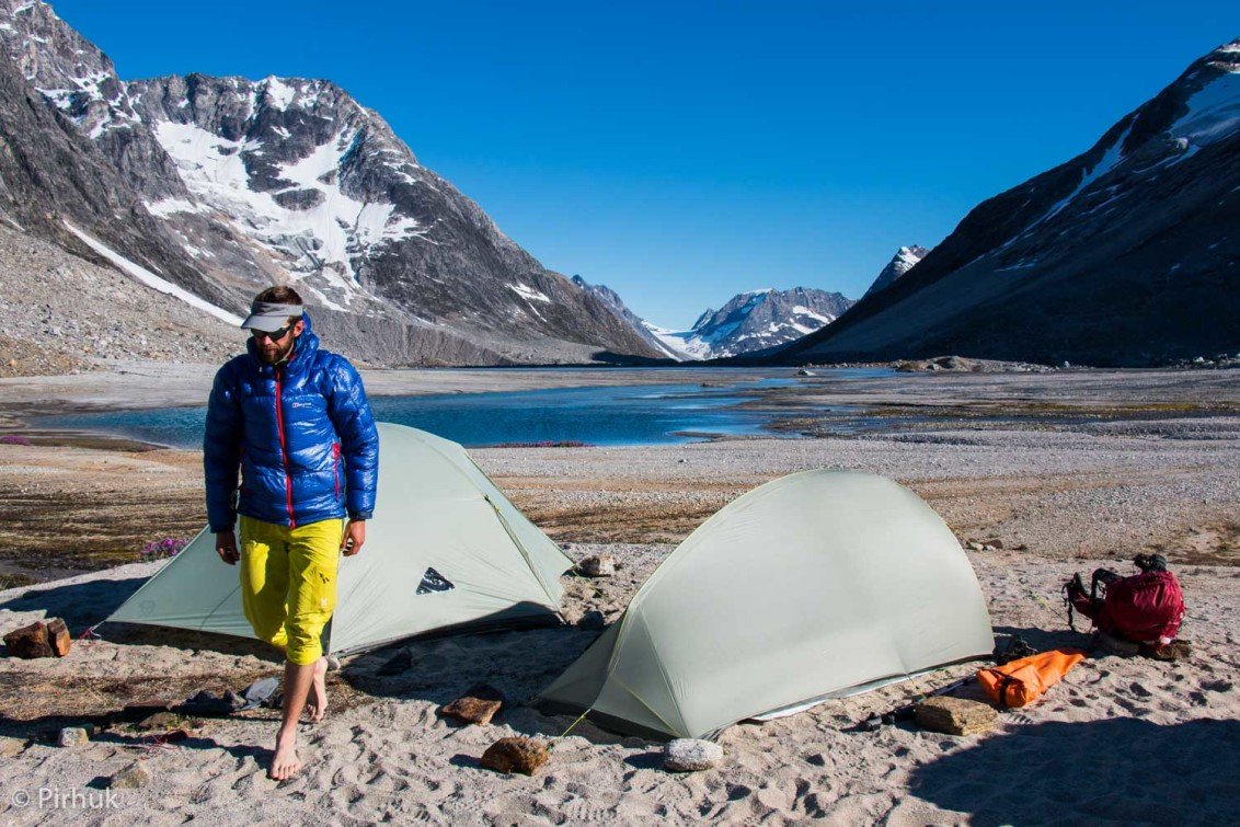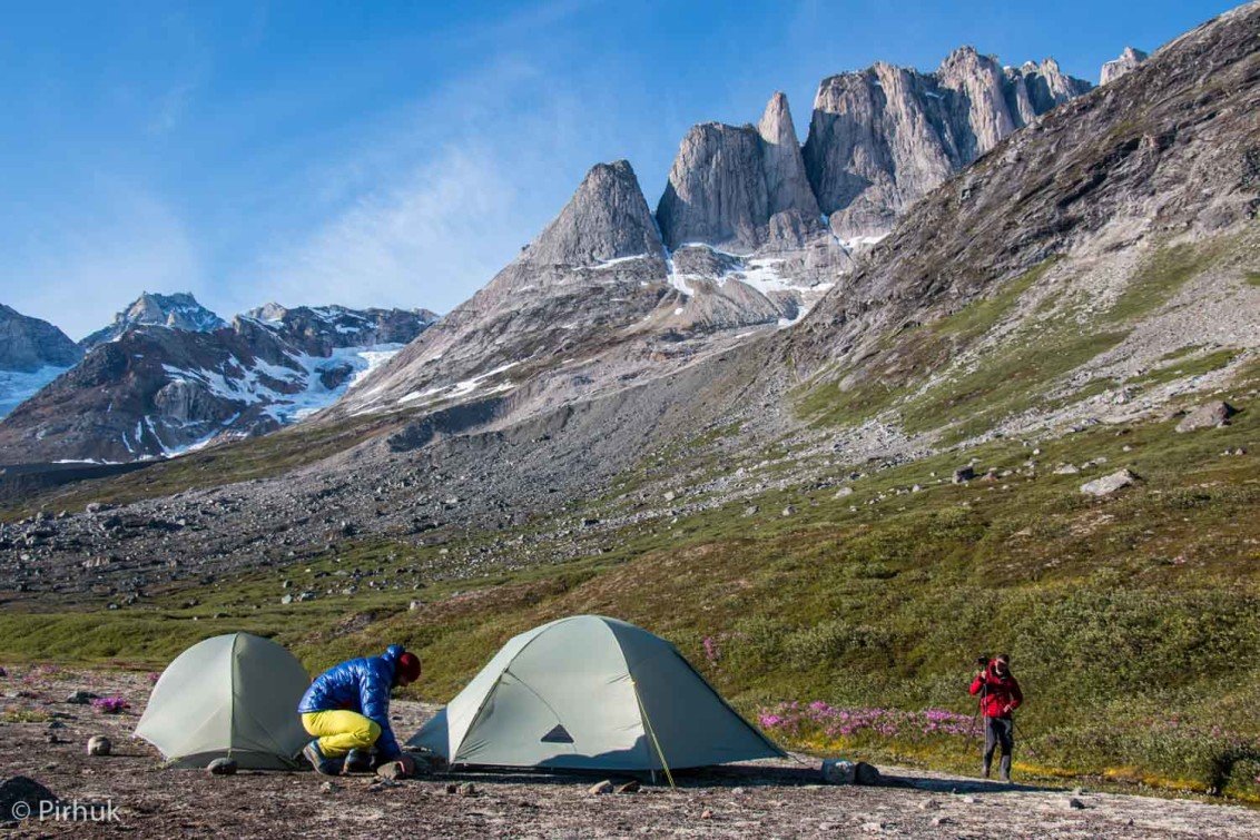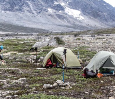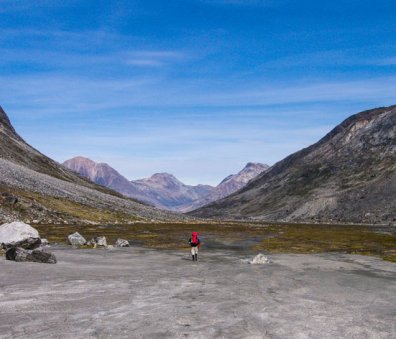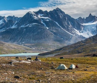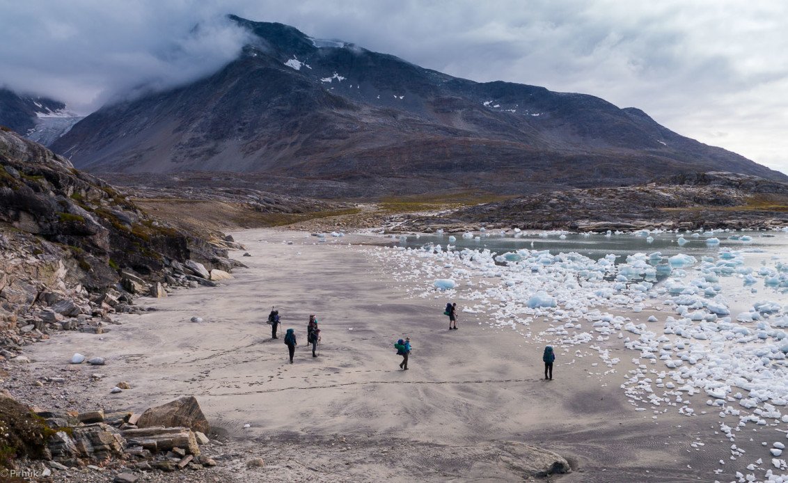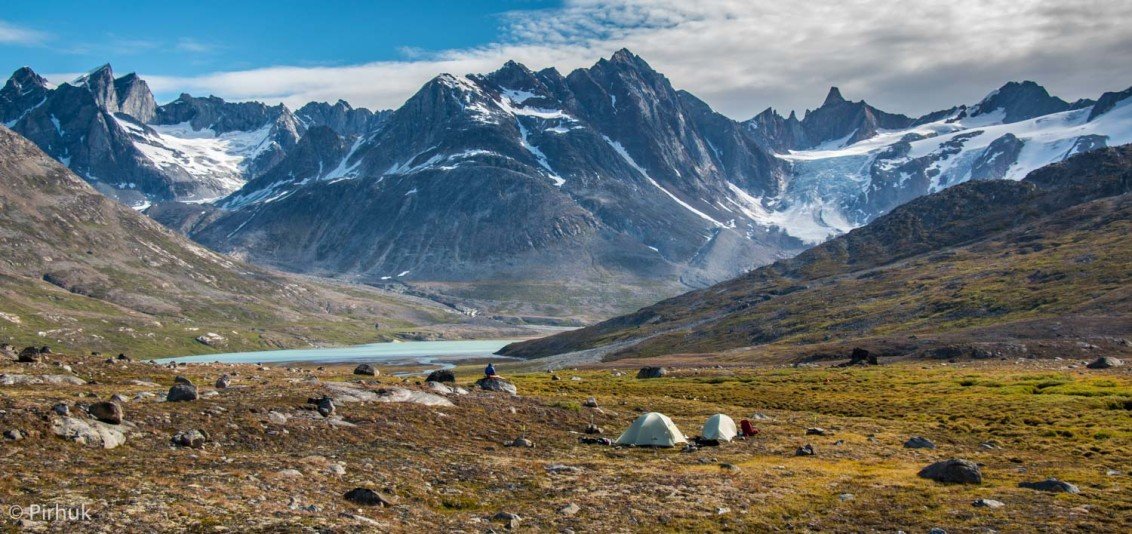 At our northern-most point, we leave the ice of Sermilik behind, gaining height to cross a pass before following a deep valley that cuts through the high spires of the Caledonian Alps as well as the big walls of the Fox’s Jaw. We follow another arctic char stream, this time braided across the valley-floor, to reach the head of the Ammassalik fjord system and the end of an epic route. We'll spend one last night in the fjords, looking south toward the coastal mountains around Kulusuk.