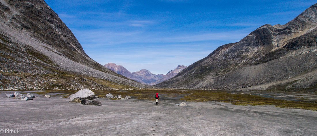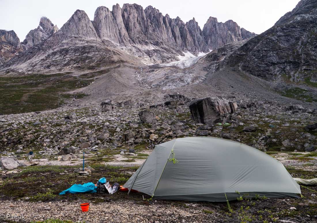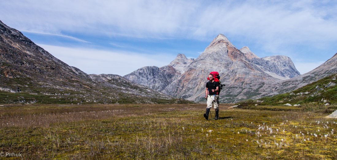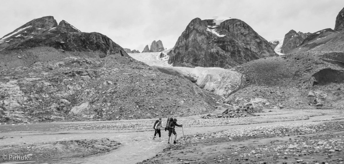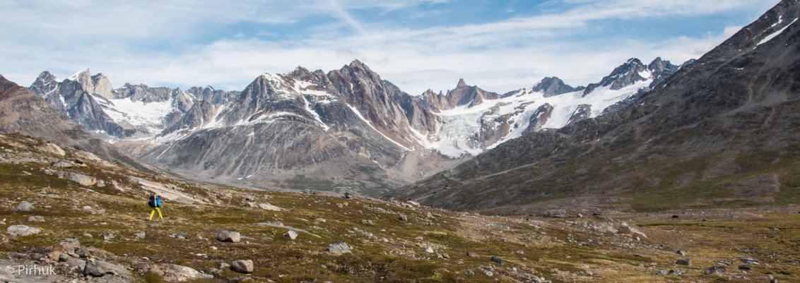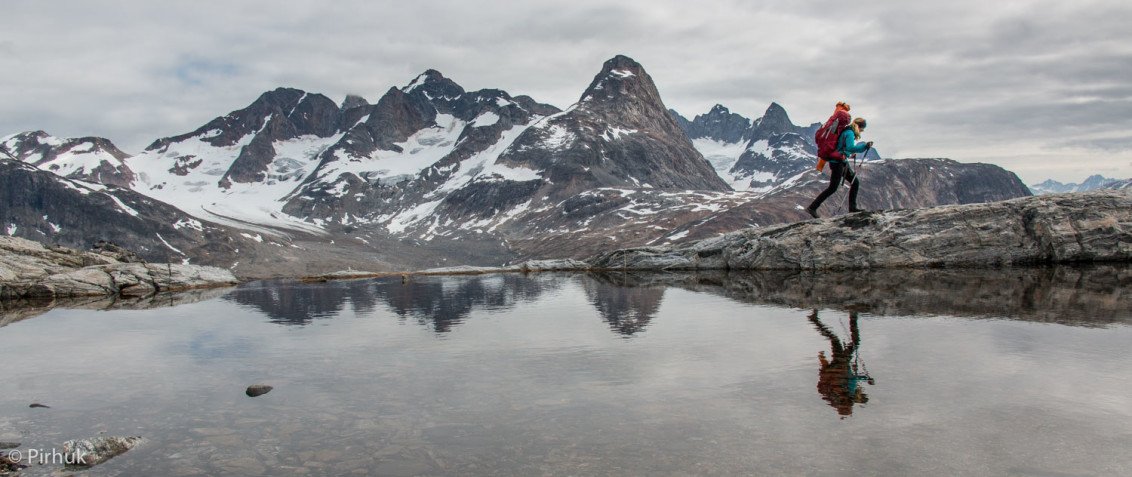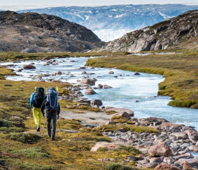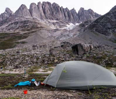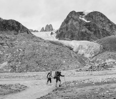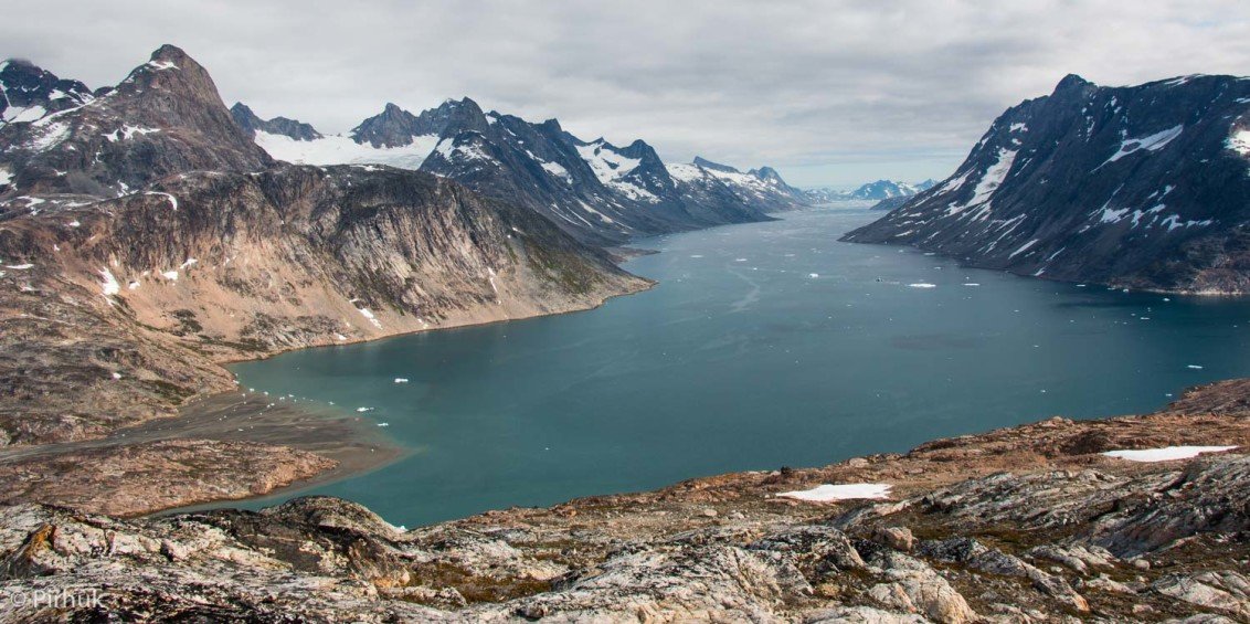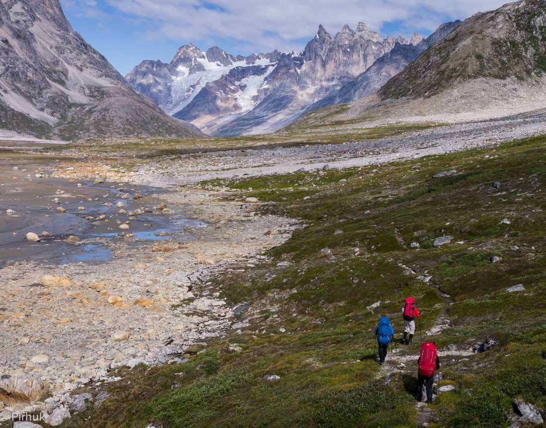 At our northern-most point, we leave the ice of Sermilik behind, gaining height to cross a pass before following a deep valley that cuts through the high spires of the Caledonian Alps as well as the big walls of the Fox’s Jaw. We follow another arctic char stream, this time braided across the valley-floor, to reach the head of the Ammassalik fjord system and the end of an epic route. We'll spend one last night in the fjords, looking south toward the coastal mountains around Kulusuk.