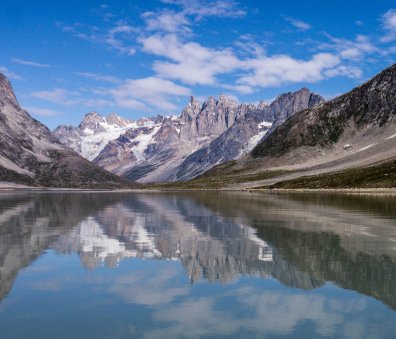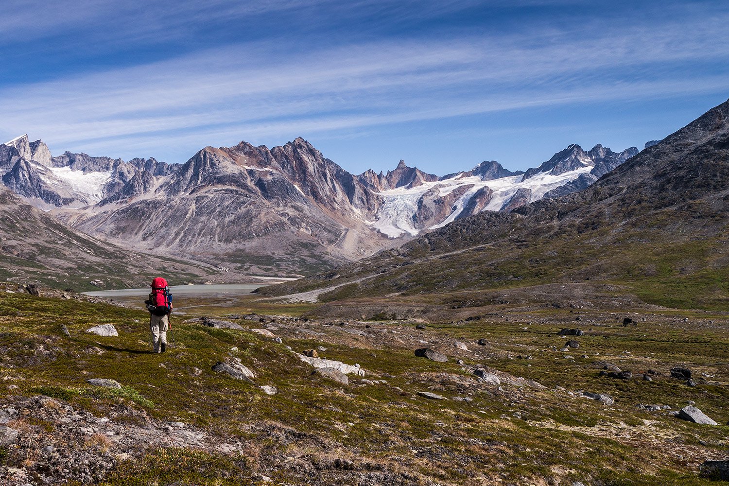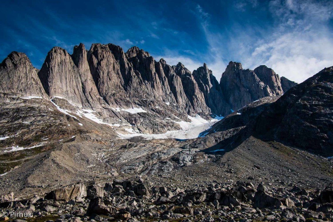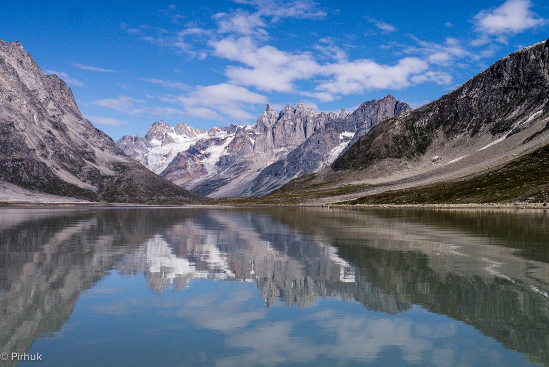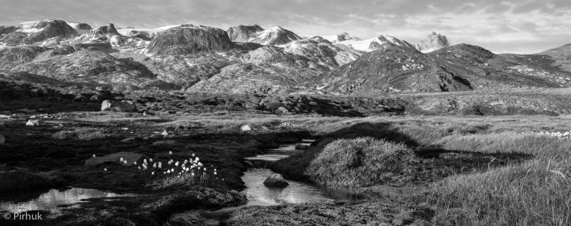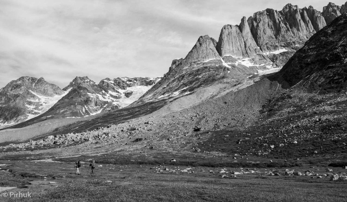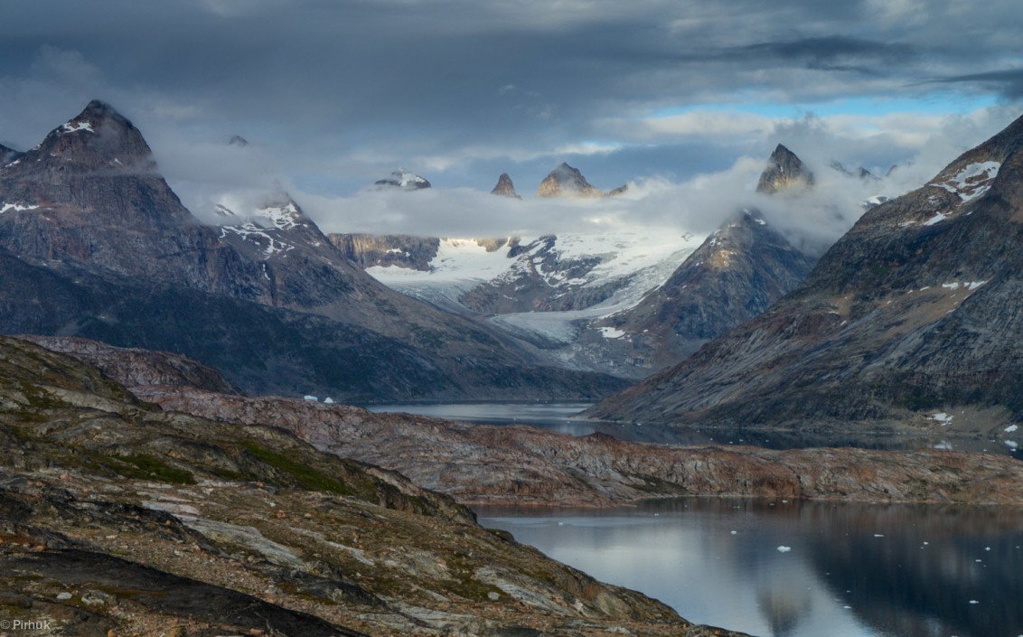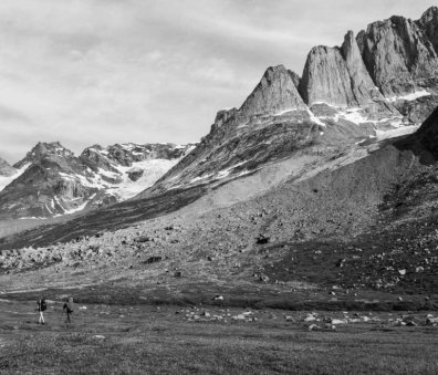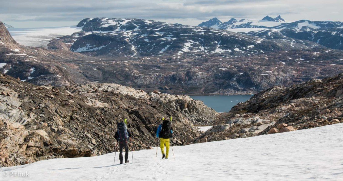 At our northern-most point, we leave the ice of Sermilik behind, gaining height to cross a pass before following a deep valley that cuts through the high spires of the Caledonian Alps as well as the big walls of the Fox’s Jaw. We follow another arctic char stream, this time braided across the valley-floor, to reach the head of the Ammassalik fjord system and the end of an epic route. We'll spend one last night in the fjords, looking south toward the coastal mountains around Kulusuk.