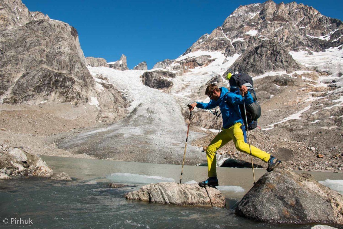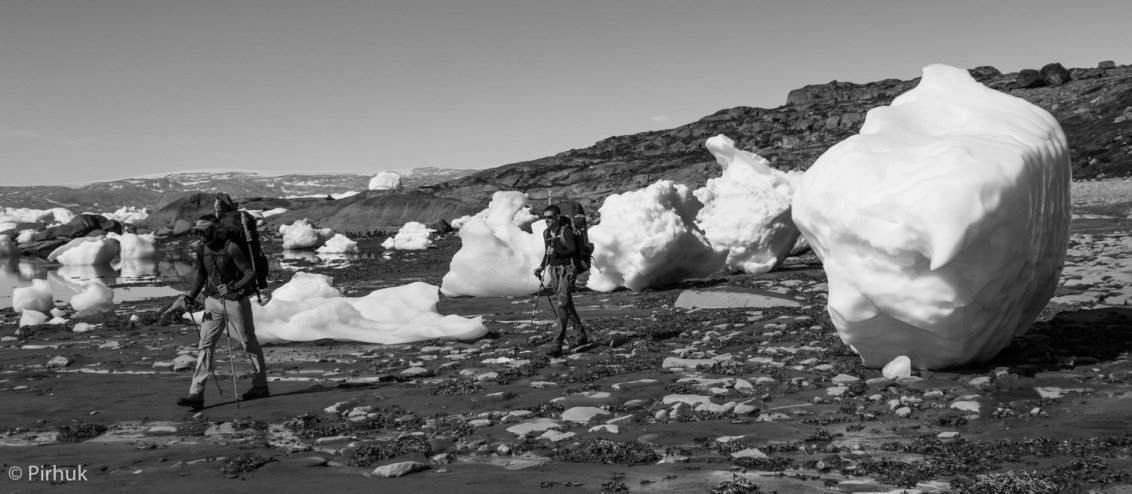 Back on Sermilik Fjord, we'll move into the crux of the journey, a steep section of coastline where knowledge of the intricate traverse line is invaluable in crossing an area of slabs. We then need to time our crossing of a glacier melt-stream with a low-tide to reach our northern-most point.