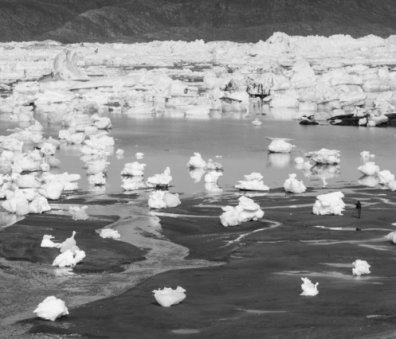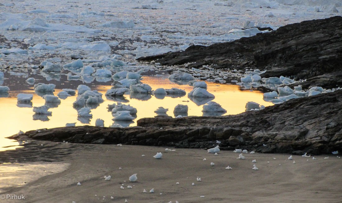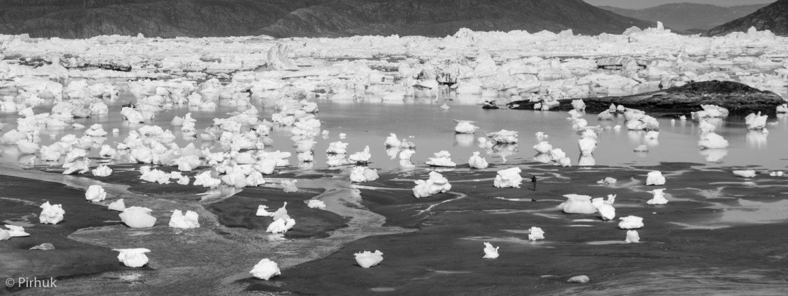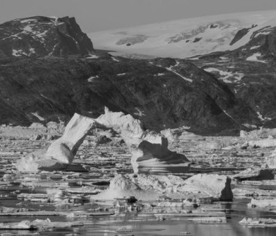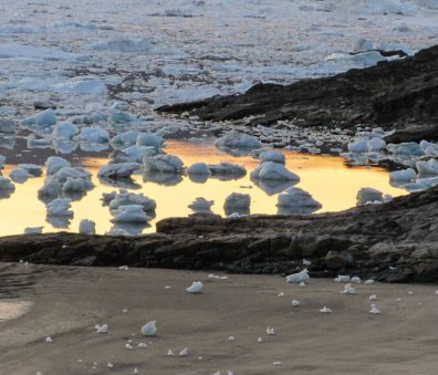 Reaching Sermilik fjord, we follow the shoreline north. The water is crowded with vast quantities of ice, from 'bergs many hundreds of metres long to small pieces of brash ice that strand on the shoreline at low tide. The far, western flank of the fjord is inundated by Greenland's icecap, second only in size to Antarctica.