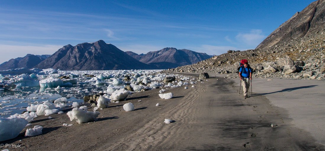 The terrain we'll be traversing is both intricate and rugged. It's sometimes possible to follow the tideline, walking on beaches of glacial outwash, but we also often gain height over headlands and steeper ground. On the most complex sections, we may only cover upwards of 10km in the course of a full day.